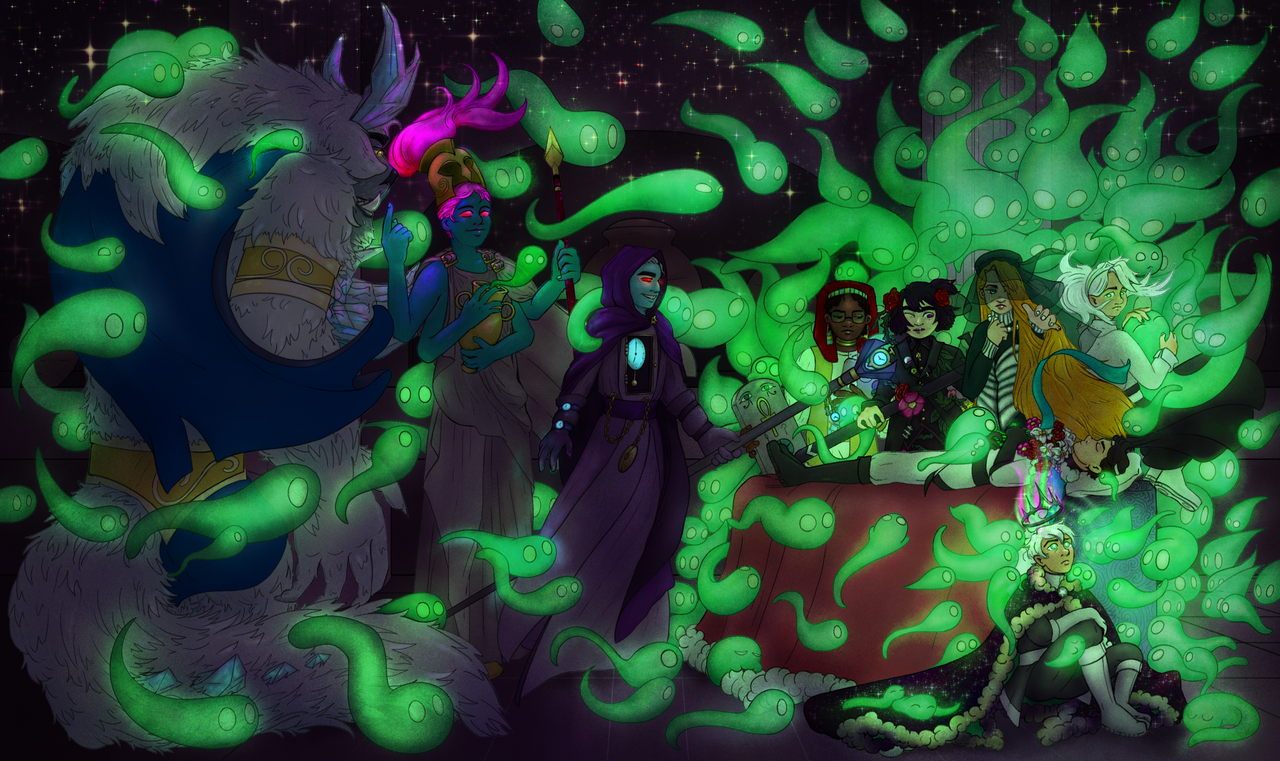 There are still Gifts to be bestowed, but the ceremony itself is over. The King has been crowned. The Realms, satisfied, purrs happily all around them. From the corners of the room, the wary blob ghosts emerge, creeping forward in their curiosity until they swim and dart about the procession’s participants.