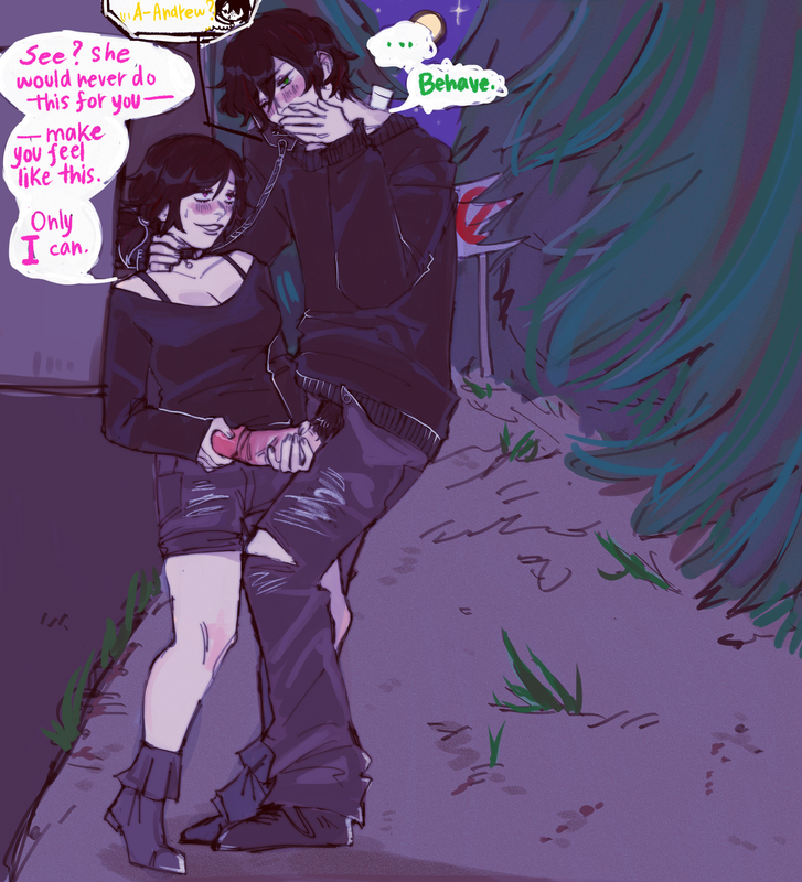 Andrew laughs, and it is a deep and dark thing that rumbles in his chest. His shoulders tremble, eyes glistening with a wetness that resembles tears, but they don’t fall. They never do. “Yeah? You mean it?” He asks, he grinds their hips together, making his cock drag along that swollen, sweet spot within her that makes her cry. He seems to know exactly where it is, knows how to fuck her at the perfect angle to stimulate it each time he bottoms out. It’s a kind of torture, one to be savored and indulged in. And it’s hers. Her cheeks feel wet, eyesight growing blurry—but even with that, he is all that she can see. His tongue flicks out, tasting her tears as she feels him shiver like he loves the flavor of her pain. He probably does.